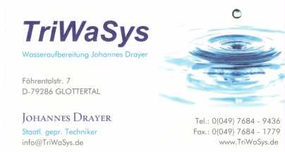 Unter der Markenbezeichnungen TriWaSys (R) steht Ihnen jetzt ein noch größe- res Leistungsspektrum, aus dem gesamten Bereich der Trinkwassertechnik, zur Verfügung. Dabei unterstützen wir Sie wie bisher, aktiv mit unserer umfassenden und fachlich kompetenten Beratung, sowie den excellenten Produkten und dem zusätzlichen Know-How unserer Partner.